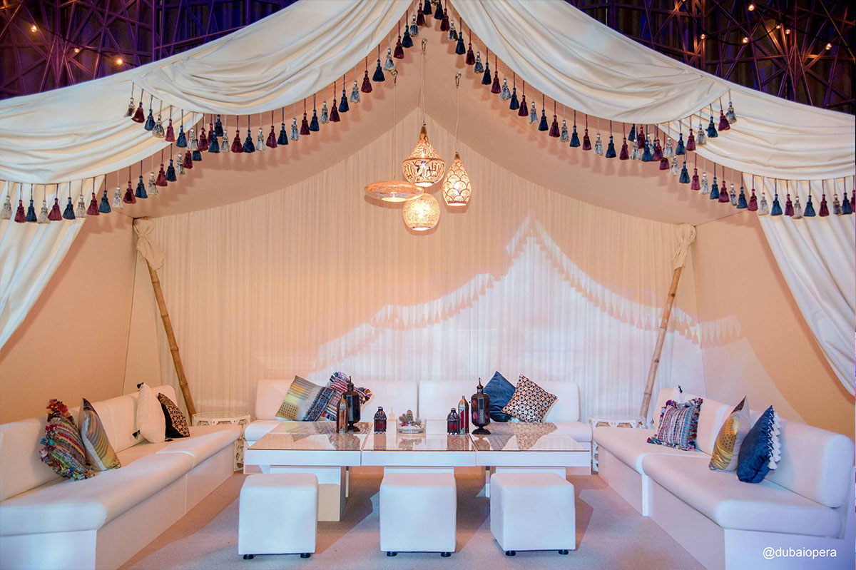 The Dubai Opera set up involved delicately combining traditional and contemporary motifs. In tune with the prestigious surroundings, unique décor elements were integrated into the surroundings, including customised stunning illuminated table tops. The mood was enhanced by Mashrabiya-like patterns using luxurious cream shades, set off by understated blue toned lighting. The majlis seating areas blended the clean lines of contemporary and traditional design with richly textured cushions against brilliant white sofas and poufs, and brass work lanterns, inlaid with brightly coloured glass, framed by generously draped tassel arches.