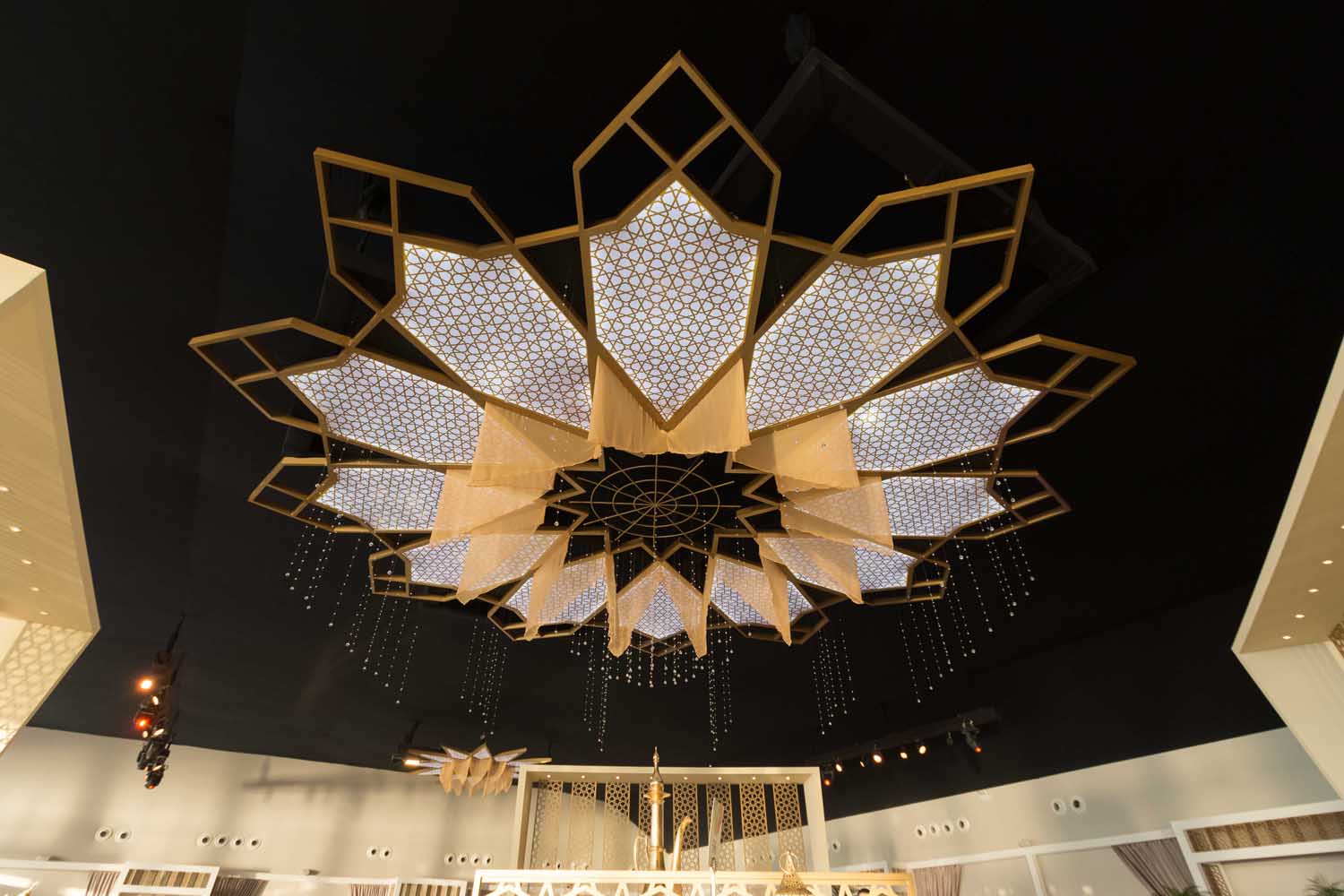 In 2018, the Dubai Opera auditorium was transformed into a magnificent banquet hall for Ramadan including four custom-built indoor majlis tents with tasselled arches and festoon lighting. The Ramadan tents made for Emirates Palace in 2014 and 2017 exuded light and a contemporary design flavour with the careful use of updated traditional elements including mashrabiya pieces. In 2014, a tent was used to expand the available space and decorated throughout using specially customised pieces such as table tops.